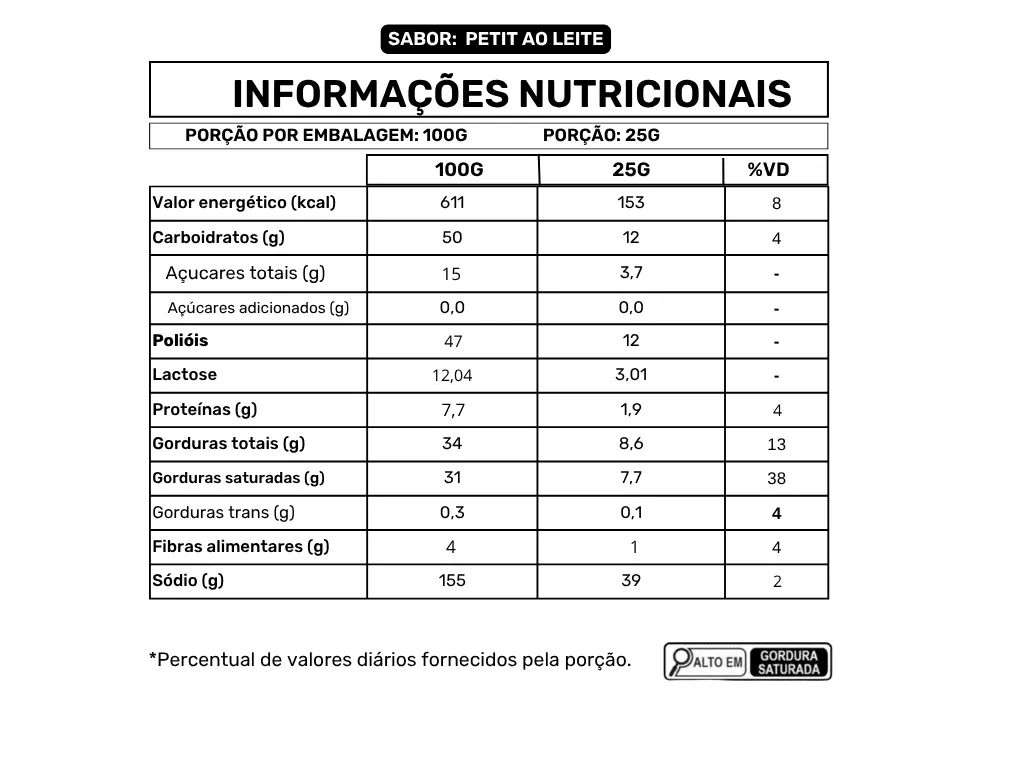 Ingredientes: Gordura vegetal, soro de leite em pó, cacau em pó, leite em pó desnatado, liquor de cacau, edulcorante maltitol, emulsificante lecitina de soja, estabilizante poliglicerol polirricinoleato e aromas.