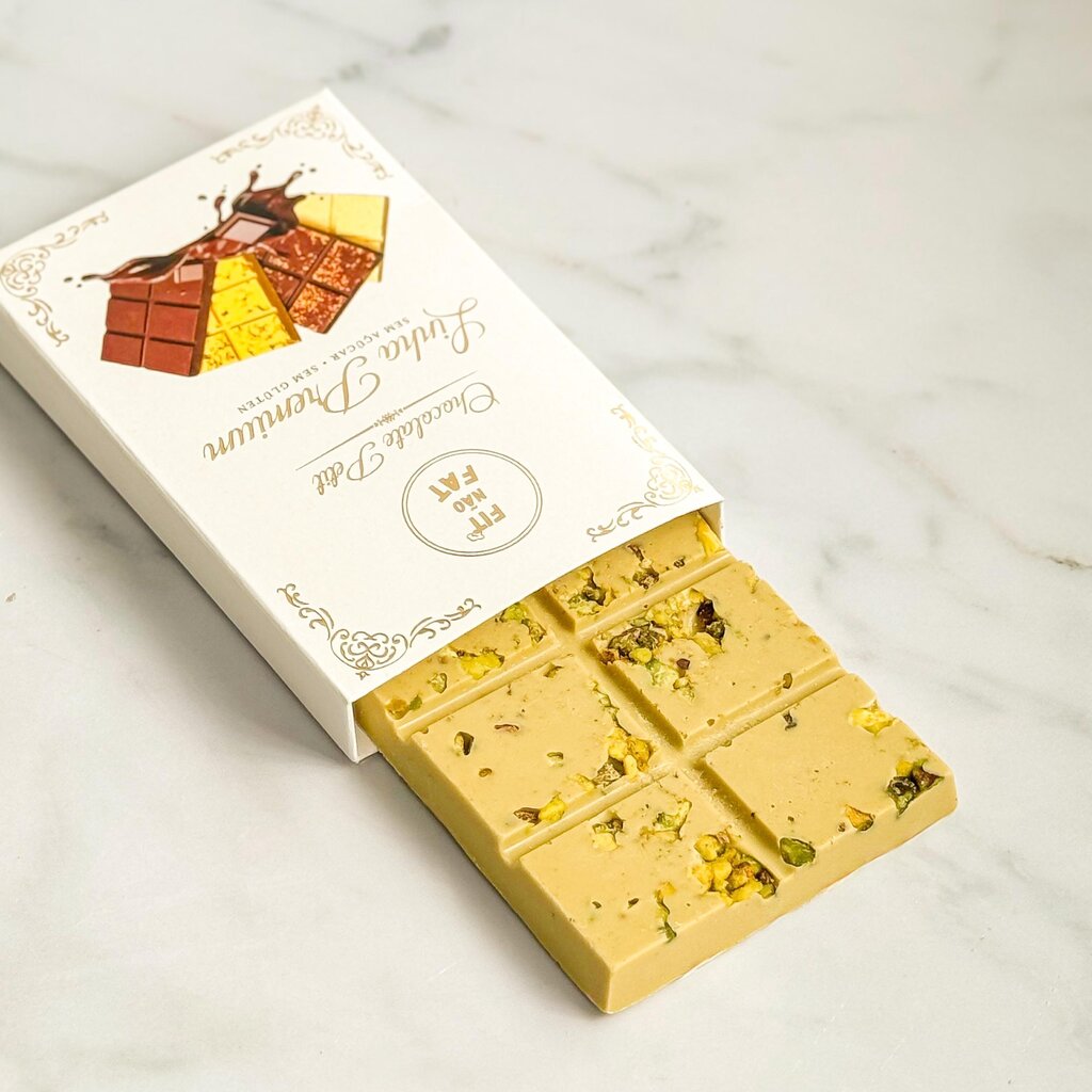 Chocolate branco nobre, pistaches crocantes e puro sabor de pistache. Uma experiência única!