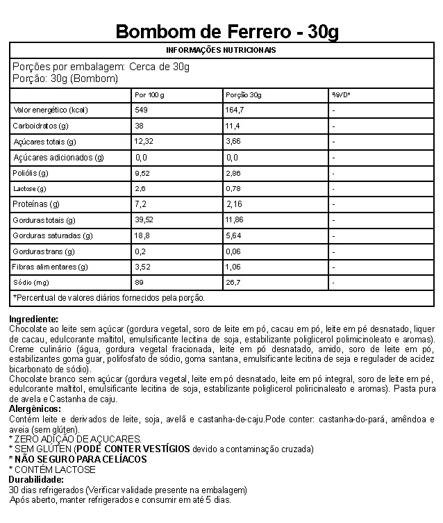 Ingredientes: Chocolate ao leite sem açúcar (gordura vegetal, soro de leite em pó, cacau em pó, leite em pó desnatado, licor de cacau, edulcorante maltitol, emulsificante lecitina de soja, estabilizante poliglicerol polirricinoleato e aromas).Creme culinário (água, gordura vegetal fracionada, leite em pó desnatado, amido, soro de leite em pó, estabilizantes goma guar, polifosfato de sódio, goma xantana, emulsificante lecitina de soja e regulador de acidez bicarbonato de sódio).Chocolate branco sem açúcar (gordura vegetal, leite em pó desnatado, leite em pó integral, soro de leite em pó, edulcorante maltitol, emulsificante lecitina de soja, estabilizante poliglicerol polirricinoleato e aromas). Pasta pura de avelã e castanha de caju.