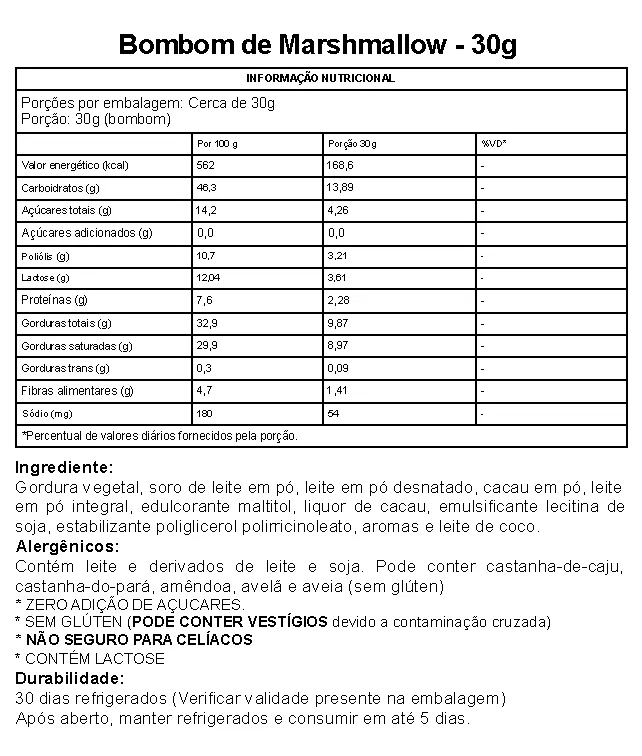 Ingredientes: Gordura vegetal, soro de leite em pó, leite em pó desnatado, cacau em pó, leite em pó integral, edulcorante maltitol, liquor de cacau, emulsificante lecitina de soja, estabilizante poliglicerol polirricinoleato, leite de coco e aromas.