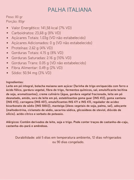 ATENÇÃO: Palha italiana e pão de mel. Conservar em temperatura ambiente por até 4 dias( em local seco e arejado)/ OU em refrigeração até a data de validade. Ou 3 meses congelado.