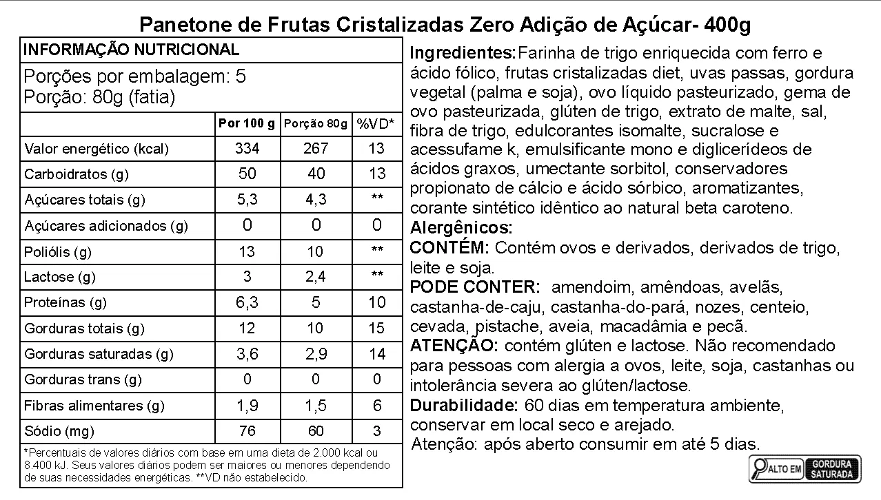 Ingredientes:Farinha de trigo enriquecida com ferro e ácido fólico, frutas cristalizadas diet, uvas passas, gordura vegetal (palma e soja), ovo líquido pasteurizado, gema de ovo pasteurizada, glúten de trigo, extrato de malte, sal, fibra de trigo, edulcorantes isomalte, sucralose e acessufame k, emulsificante mono e diglicerídeos de ácidos graxos, umectante sorbitol, conservadores propionato de cálcio e ácido sórbico, aromatizantes, corante sintético idêntico ao natural beta caroteno.