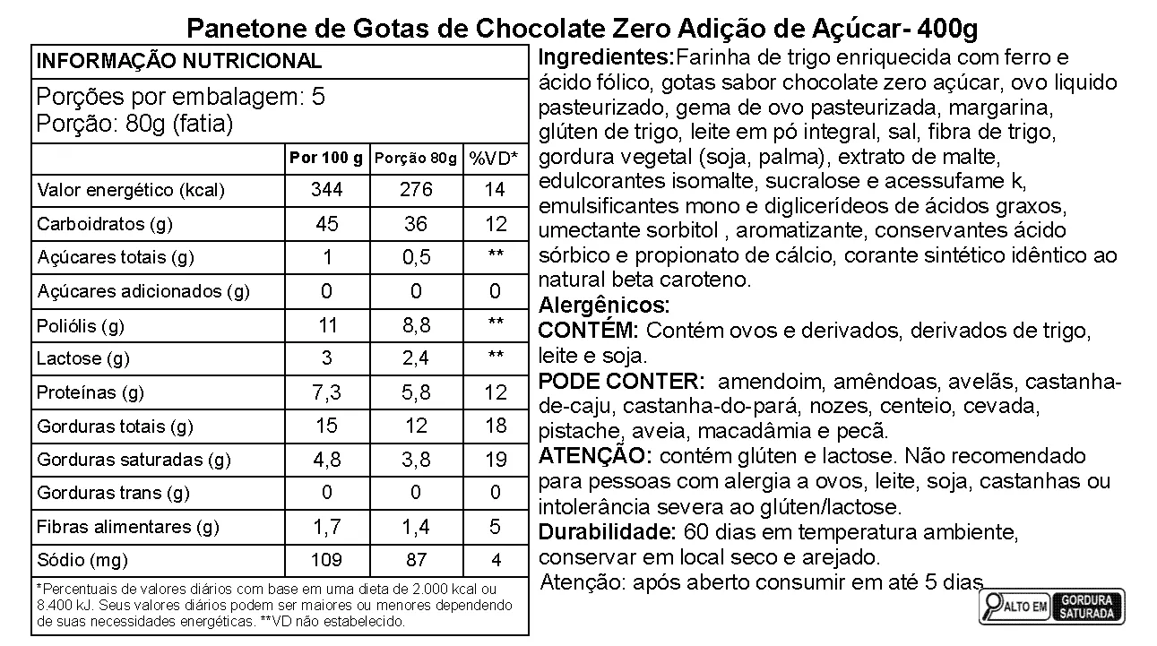 Ingredientes: Farinha de trigo enriquecida com ferro e ácido fólico, gotas sabor chocolate zero açúcar, ovo liquido pasteurizado, gema de ovo pasteurizada, margarina, glúten de trigo, leite em pó integral, sal, fibra de trigo, gordura vegetal (soja, palma), extrato de malte, edulcorantes isomalte, sucralose e acessufame k, emulsificantes mono e diglicerídeos de ácidos graxos, umectante sorbitol , aromatizante, conservantes ácido sórbico e propionato de cálcio, corante sintético idêntico ao natural beta caroteno.