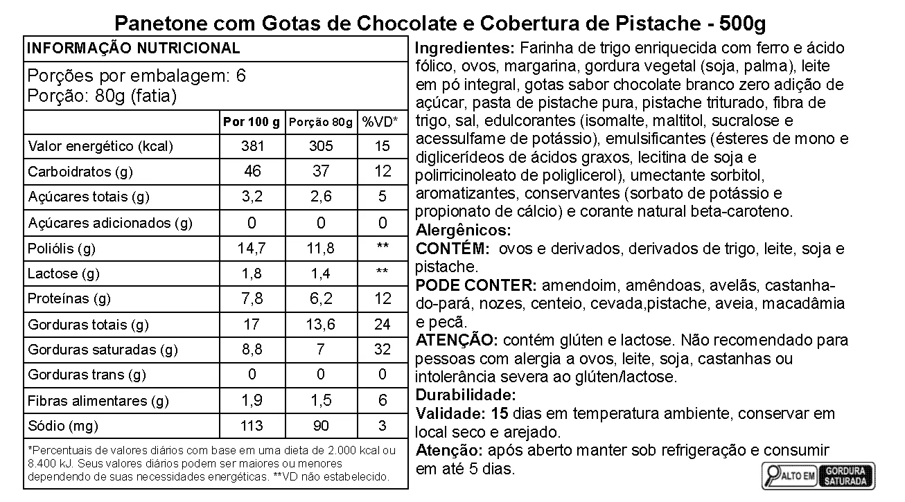 Alergênicos: Contém ovos e derivados, derivados de trigo, leite, soja e pistache. Pode conter